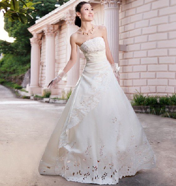 2011 A Line Sreapless Satin Beased Embroidered Floor Length Lace Up Hollow Pattern White Wedding Dress |