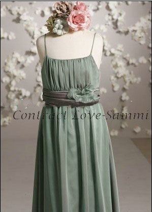 Tahitian luminescent chiffon A-line junior bridesmaid dress, square neckline, gathered band at empire bodice with flower detail.