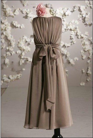 Stone luminescent chiffon A-line tea-length junior bridesmaid gown, jewel neckline, gathered band at natural waist with flower detail.