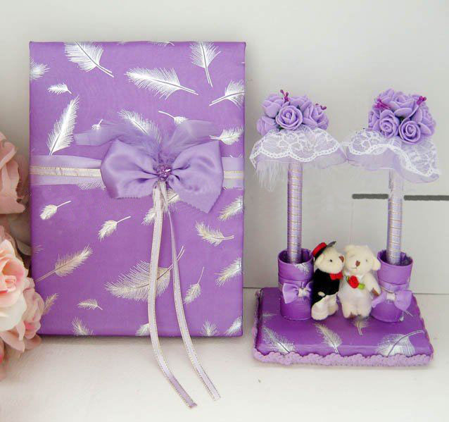 Matching in three sets,incluting a ring pillow,guest book and a pen holder in this wedding set.One is pen holder,the other is guest book.Best price from others products.