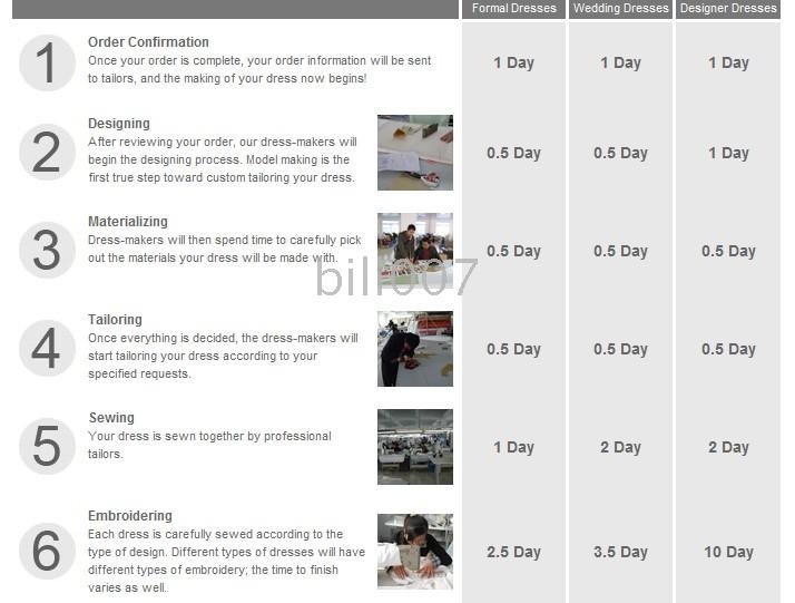 It will take 11-13 working days to tailor your dresses by professional dressmaker. It will then take about 3-5 working days for the package travel from our facilities to your destination, the exact shipping time is based on the shipping company (UPS, DHL, TNT ,etc) standard
