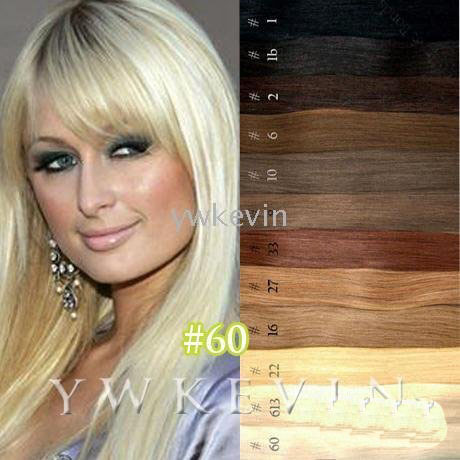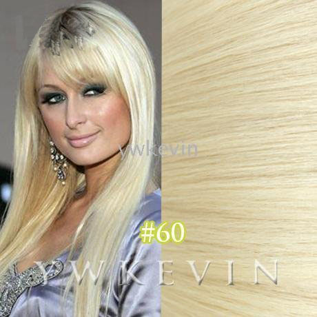 2) Color:60# platinum blonde 3) Length: 20 Inches(accept your custom-made,like 16",22",24",26") 4) Weight: 100g/set(we can do as your request,like 70g,80g,90g/set) 6) Hair type: We guarantee that the hair we sell is made of 100% Natural Remy Human Hair. 7) AAA High quality, tangle free, silky soft. 8) The hair can be curled, straightened, dyed to be darker instead of lighter. 9) High quality metal clip with rubble silicone back, attached on hair. 10) Easy to attach and remove.
