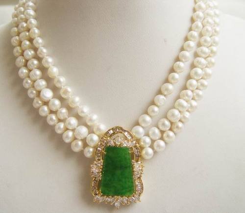 Beautiful 3 Rows White Pearl Green Silver Jade Necklace |
