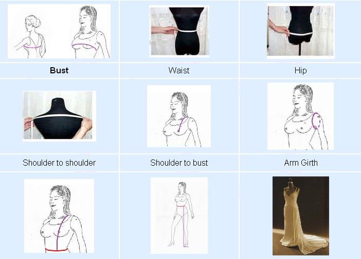 Full length (Net Size: from Shoulder to feet): This is the length from your shoulder to your feet (No shoes). You should stand upright and your feet should keep together. Let the tape across your bust (culmination) in the front and drop naturally.