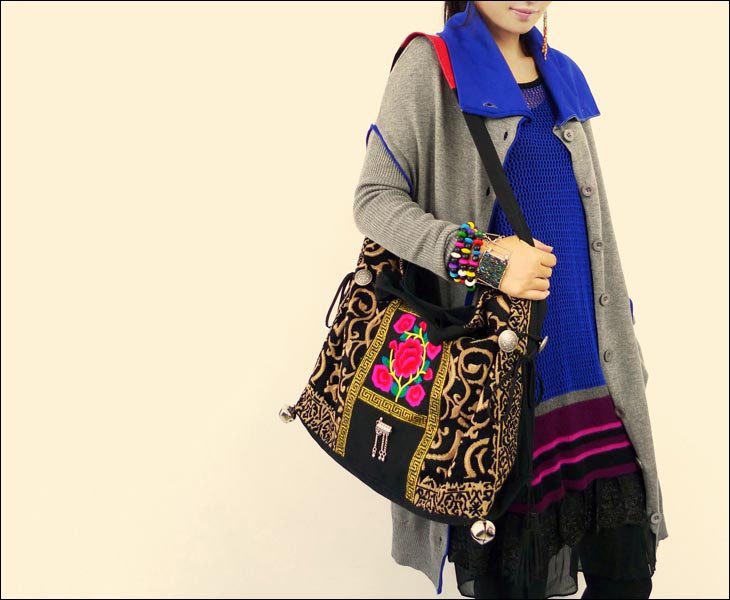 Black with Multi-color Embroidery Canvas Lady's Fashion Multi-usage Tote Dual Function Bags |