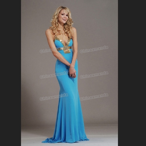 Blue Chiffon Backless V Neck With Straps Prom Dresses |