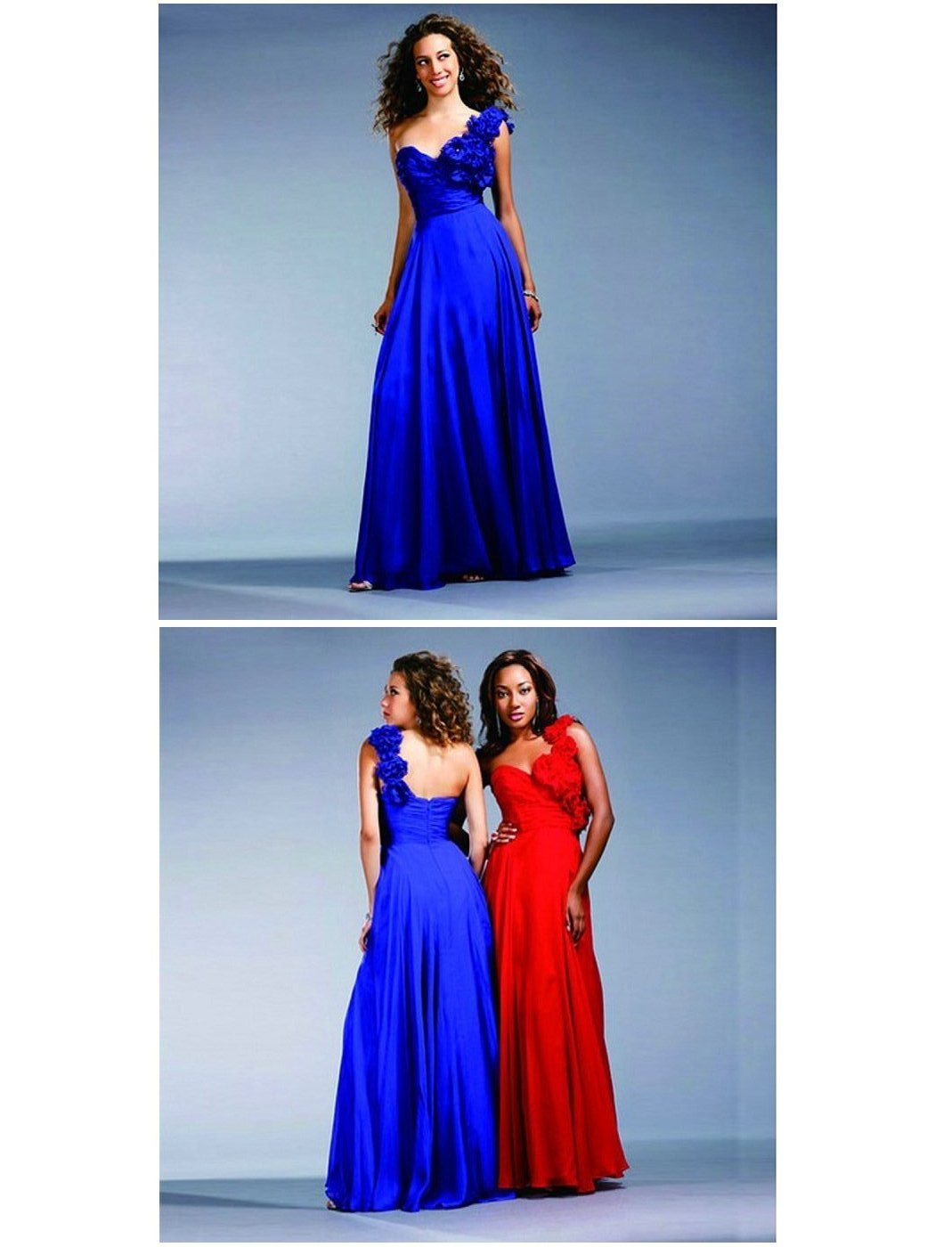 Blue One Shoulder Floor Length Prom Dress with Floral Embellishment On Shoulder |