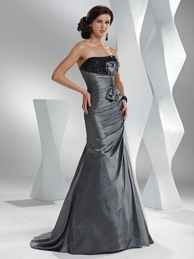 Charcoal Strapless Taffeta Fit Flare Sweep Train Featuring Jewel Encrusted Bust Dresses |