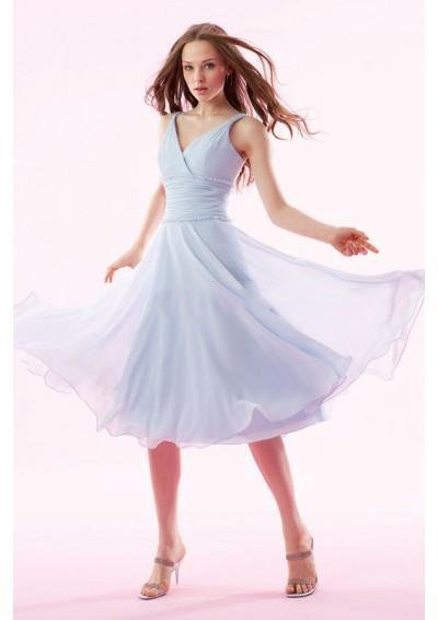 Chiffon V-neck with Rouched Waistline and A Line Tea Length Bridesmaid Dresses |