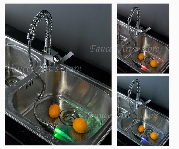 Chrome Battery-free LED Light Color Change Centerset Pull Out Kitchen Faucet +Guaranteed 100%+Free Shipping |