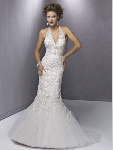 Custom Made Gorgeous Free Shipping Mermaid Organza Halter V-Neck Chapel Train Sleeveless Wedding Dresses For Bride |
