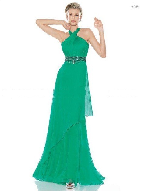 evening dresses chiffon cocktail dresses Halter Light Green Bead Floor Length.