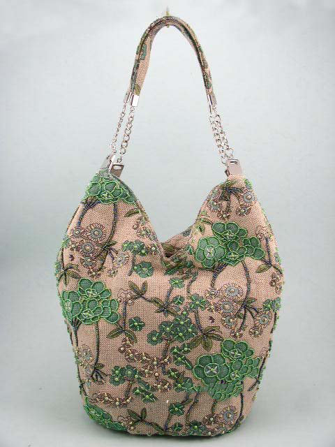Fashion Linen Beaded Green Florals Shoulder Bag Hobo |