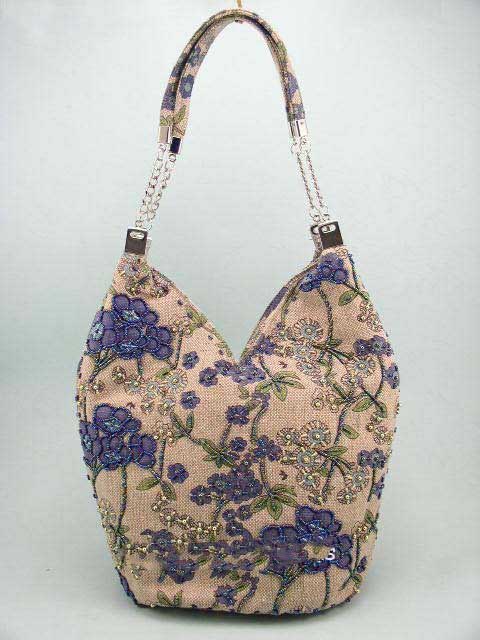 Fashion Linen Beaded Navyblue Florals Shoulder Bag Hobo |