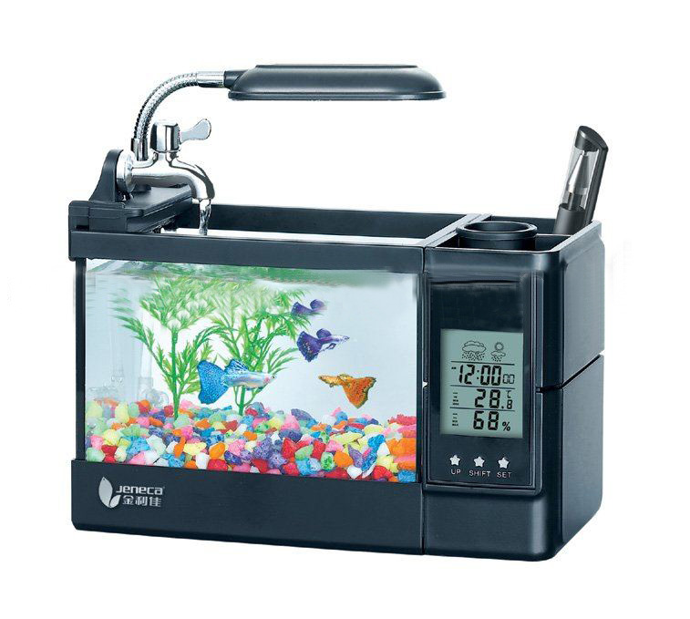 Mini aquarium/fish tank which can be put in the office desk, with water auto cycle, fuctions with calender and pen holder.fashionable cute.