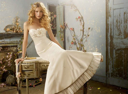 Draped strapless sweetheart neckline with empire waist and flower detail.