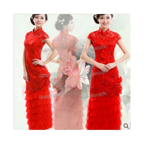 Red Layered Tulle Embroidery Cheongsam Wedding Dresses |