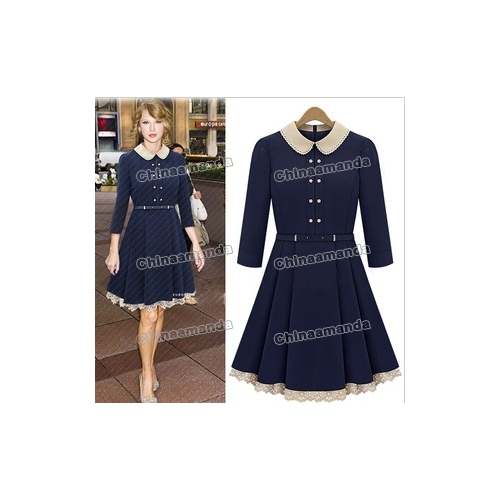 Royal Blue With Sleeves Ruffles Lace Belts Winter Dresses |