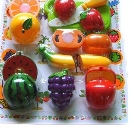 Contains: a knife, a felt board, an eggplant (can be divided into two sections) an apple (can divide the two pieces of) a watermelon (can divide two sections) a banana (can divide two sections) a grapes (can divide two sections) a pepper (can be divided into two sections) a corn (can divide two sections) a strawberry (can be divided into 2 half) an orange (can be divided into two sections) accessories really counted more than oh