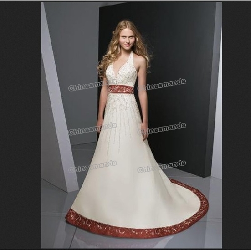 V Neck Court Train White With Red Bow Empire Wedding Dresses |