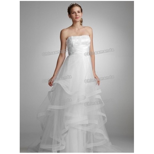White Strapless Princess Sequined Layered Tulle Long A-line Wedding Dresses |